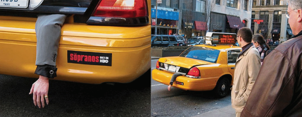 HBO, New York’un işlek caddelerinde taksi bagajlarından sarkan sahte cesetlerle The Sopranos’un karanlık mafya atmosferini gündelik hayata taşıdı.